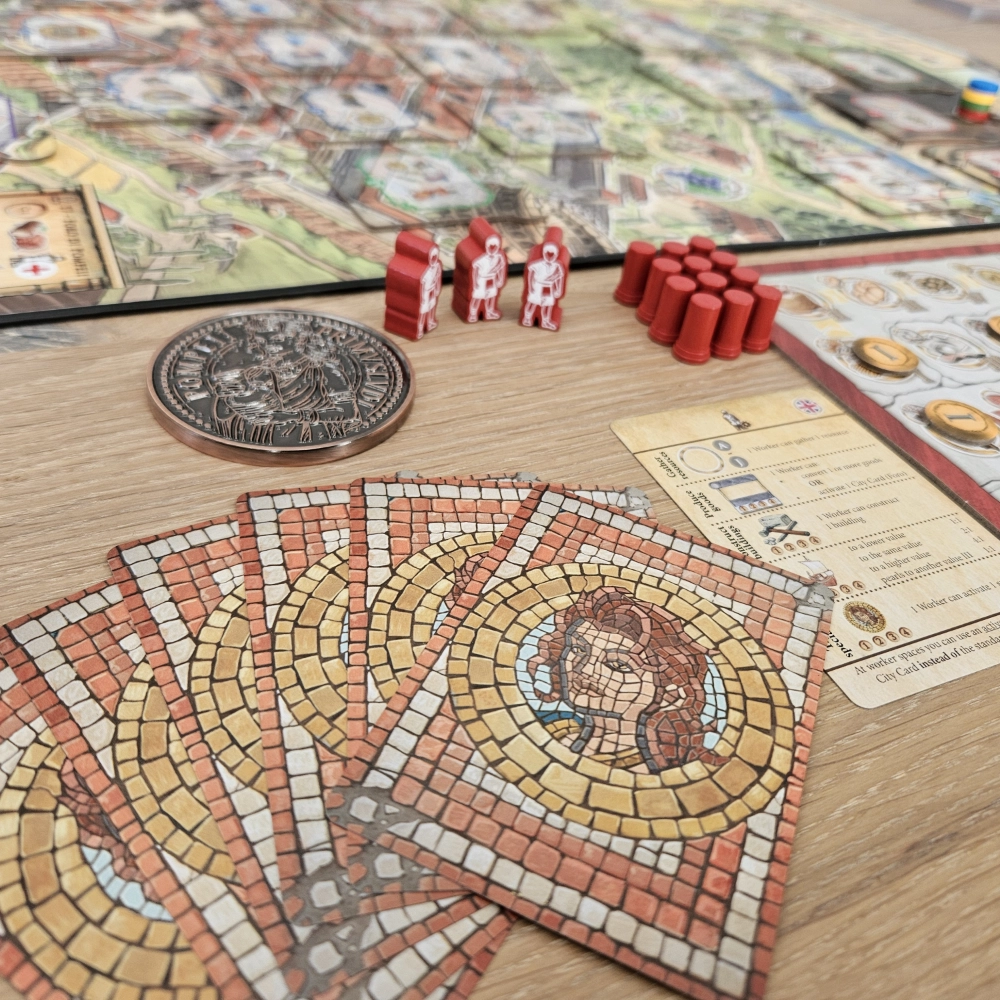 Next to standard actions, you can also choose to take a card action: activated specialists and city locations (based on the archeological site of Pompeii) with immediate actions or recurring actions.