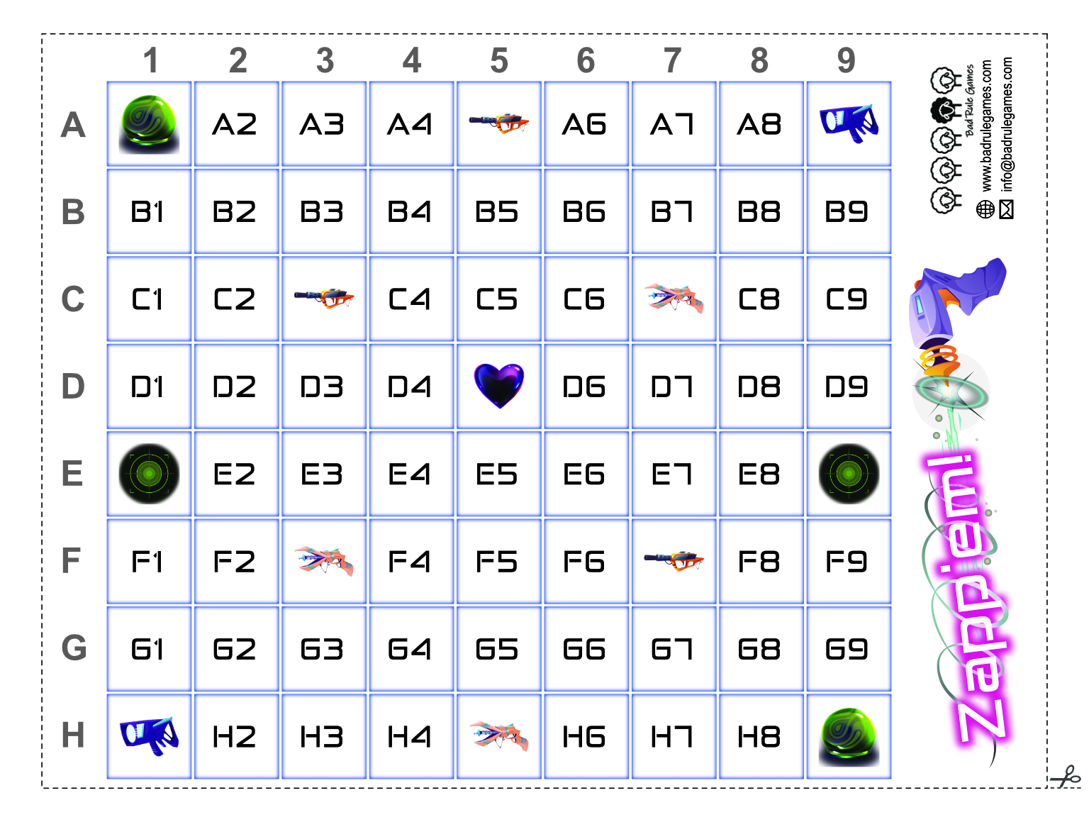 📍where is everybody hiding: je weet waar jouw tegenstanders zich bevinden aan de hand van hun meest recent gespeelde locatie kaart die boven hun speler kaart is geplaatst. Dit betekend dat je Zapp´em in de basis speelt zonder spelbord/grid en locatie markers. Als je er echter de voorkeur aan geeft om te visualiseren waar iedere speler staat, dan is er bij aankoop een setje met een overzichtskaart en gekleurde blokjes beschikbaar als optie. Als alternatief kan je het 9 x 8 grid hierdownloaden. Print het bestand en gebruik gekleurde blokjes of pionnen uit jouw eigen voorraad.